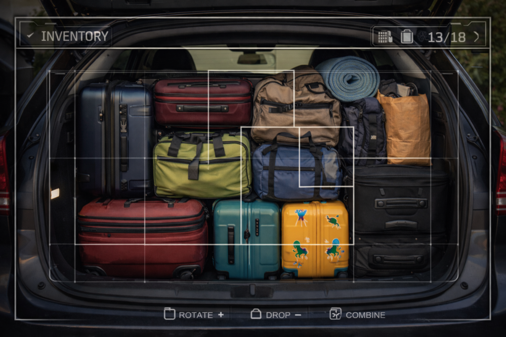 L’installation commence par le coffre de la voiture. Très vite, l’espace devient un champ de bataille stratégique. Les sacs apparaissent par vagues successives, les valises se multiplient mystérieusement. Je me surprends à analyser la situation avec le sérieux d’un joueur devant l’inventaire de Resident Evil 4.